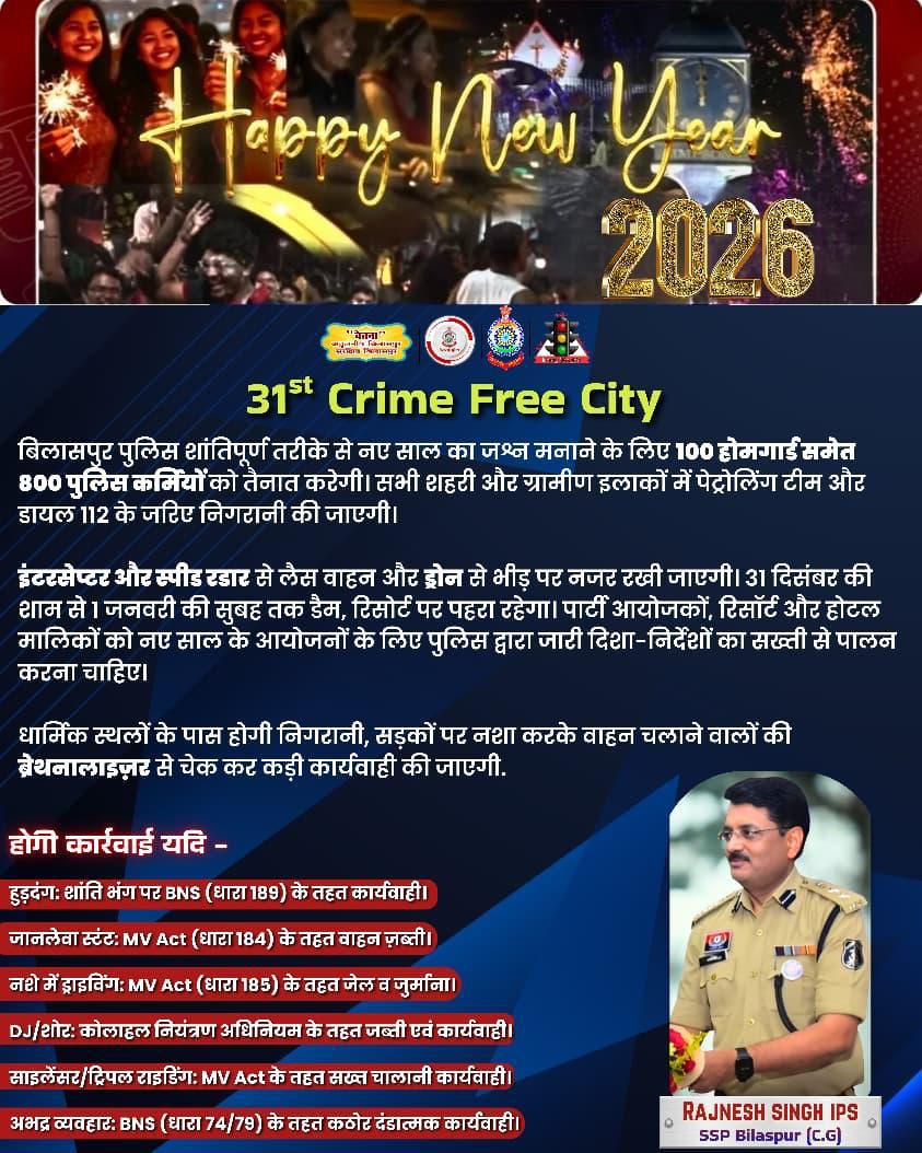 इस बार एक अनोखा नियम लागू किया गया है—यदि कोई ग्राहक पार्टी में नशे में धुत हो जाता है, तो उसे सुरक्षित घर पहुंचाने की जिम्मेदारी आयोजक की होगी। बिना लाइसेंस शराब परोसने पर होटल या फार्म हाउस का लाइसेंस रद्द कर दिया जाएगा। इस साल केवल 12 जगहों को ही शराब परोसने का लाइसेंस मिला है, जबकि पिछले साल यह संख्या 42 थी।Chhattisgarh New Year Guidelines/दुर्ग: नए साल 2026 के स्वागत के लिए जहां पूरा छत्तीसगढ़ तैयार है, वहीं प्रदेश की पुलिस ने भी ‘मिशन न्यू ईयर’ के तहत सुरक्षा के कड़े घेरे तैयार कर लिए हैं।