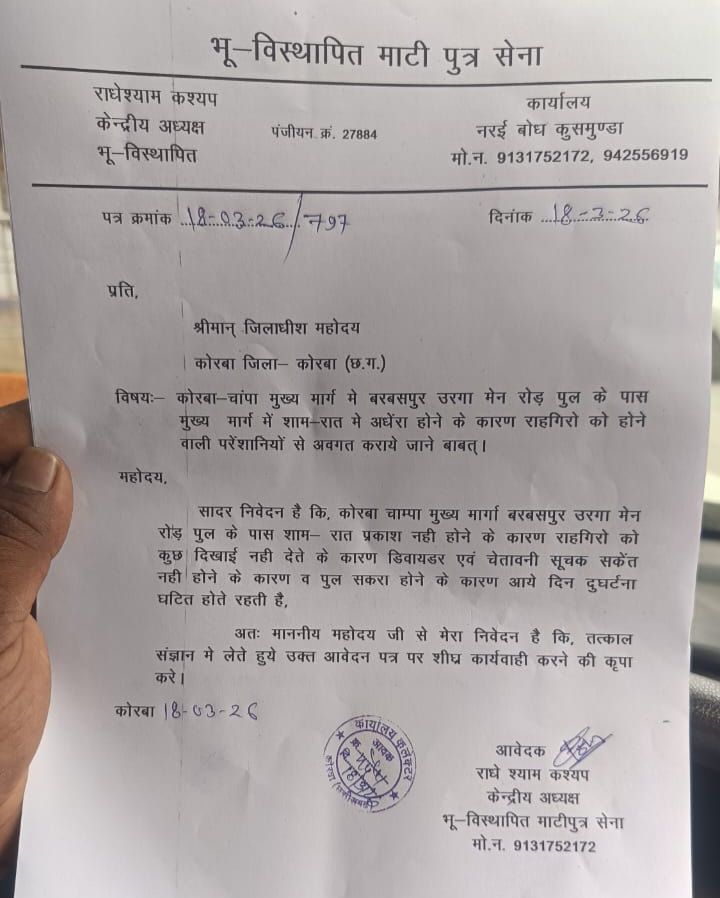 कोरबा–चांपा मुख्य मार्ग स्थित बरबसपुर उरगा मेन रोड पुल के समीप रात्रि के समय पर्याप्त प्रकाश व्यवस्था नहीं होनें के कारण राहगीरों को गंभीर परेशानियों का सामना करना पड़ रहा है, इस संबंध में भू-विस्थापित माटी पुत्र सेना के केंद्रीय अध्यक्ष राधेश्याम कश्यप द्वारा जिला प्रशासन को आवेदन पत्र सौंपकर समस्या से अवगत कराया गया है।