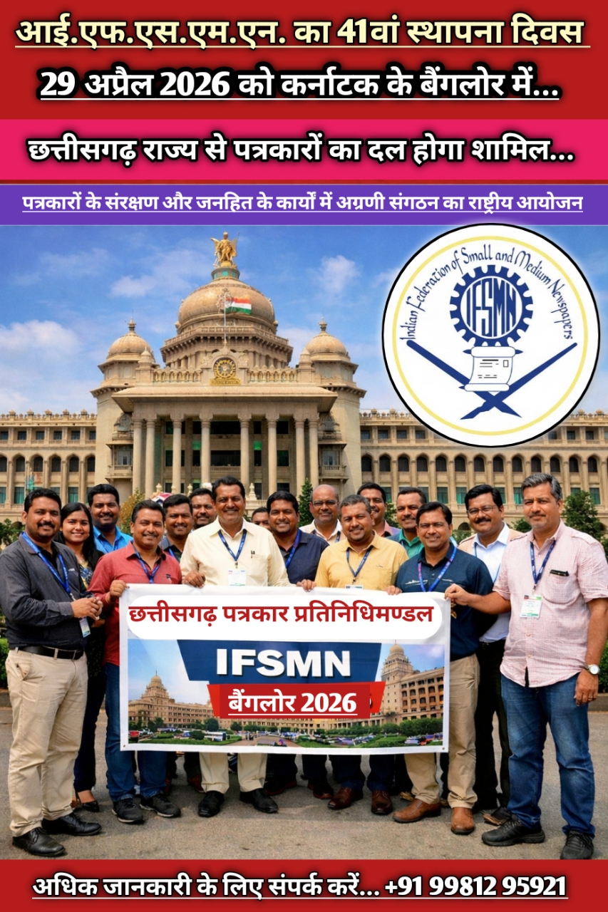 इंडियन फेडरेशन ऑफ स्मॉल एंड मीडियम न्यूजपेपर्स (आई.एफ.एस.एम.एन.) द्वारा अपनें गौरवशाली 41वें स्थापना दिवस का आयोजन आगामी 29 अप्रैल 2026 को कर्नाटक की राजधानी बेंगलोर में किया जा रहा है, यह आयोजन देशभर के पत्रकारों के लिए एक महत्वपूर्ण मंच साबित होगा, जिसमें विभिन्न राज्यों से मीडिया प्रतिनिधि अपनी सहभागिता दर्ज कराएंगे।